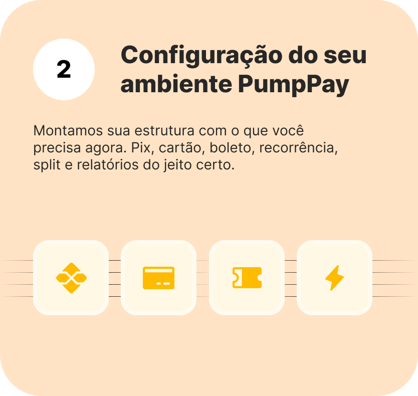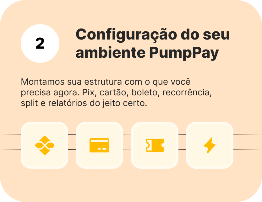 A PumpPay se adapta ao seu modelo de negócio: vendas avulsas, recorrência, checkout, links de pagamento e repasses. Você ativa o que precisa hoje e evolui conforme cresce — sem refazer tudo.