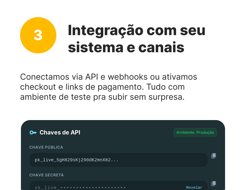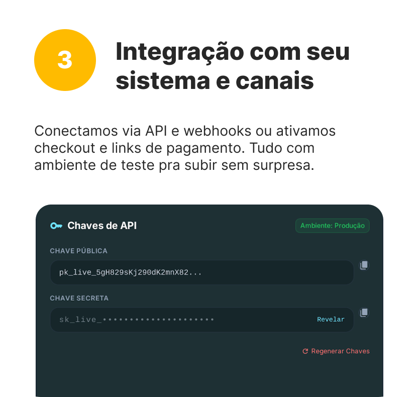 Conecte com o que você já usa via API e webhooks. Menos fricção técnica, mais velocidade no go-live.